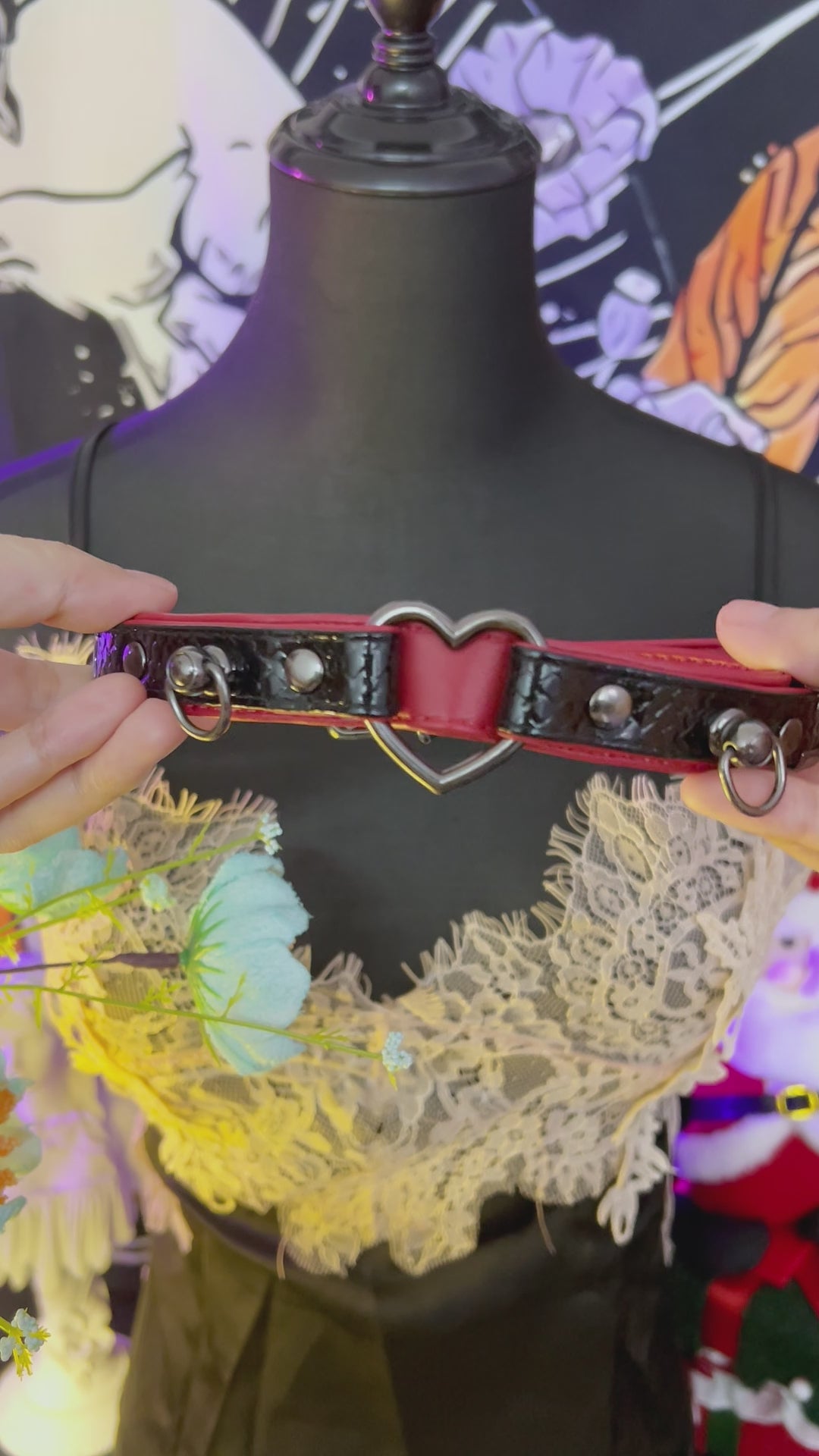 Turn up the drama with our Dark Rose Leather Choker — featuring a striking heart-shaped O-ring and paired with a matching chain leash. This piece combines deep red leather with glossy black or gold accents for a bold yet romantic vibe. Whether you choose the fierce Black Heart or the luxe Gold Heart, it’s a show-stopping statement for alternative fashion lovers.