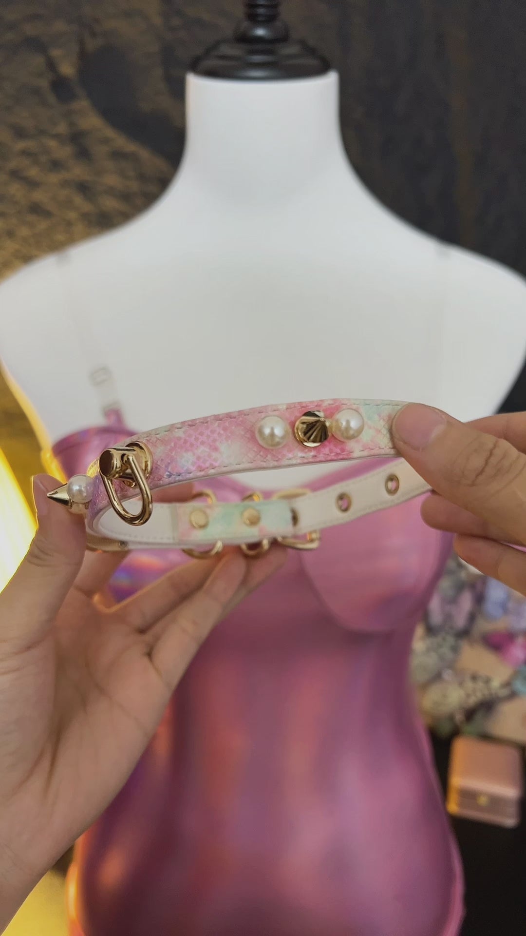 Add a bold twist to your accessory game with our Luxe Pearls & Spikes Set — where elegance meets edge. This dreamy pastel set features a pearl-detailed collar with golden spikes, paired with matching cuffs and a coordinating chain-style accessory. Perfect for fashion-forward moments, photoshoots, or statement looks that turn heads.